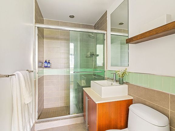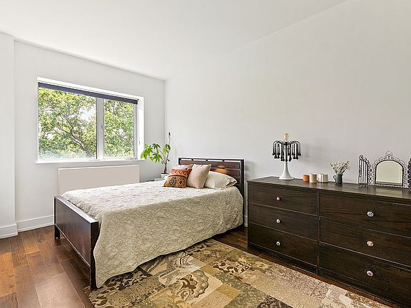Resort style living in East Williamsburg just became easy. Olive Park is a perfect blend of comfort and indulgence. Enjoy the picturesque view from your private balcony overlooking the trees of Cooper Park. This 2 bed/2 bath condo has high-ceilings and hardwood floors throughout. The open-concept sun-filled living and dining area is perfect for hosting guests. The kitchen is equipped with stainless steel appliances, Bosch stove and dishwasher and hook up for an in-unit washer and dryer. The large kitchen island with seating area has plenty of storage and counter space, allowing for comfortable cooking and entertaining. The primary bedroom has ample room for a king-sized bed and the second bedroom is perfect for an in home office or children’s/guest bedroom. Both bedrooms have closets and an abundance of natural light and views of the park. The bathrooms are outfitted with contemporary style vanities. The en-suite bathroom off the primary bedroom has a walk in rainwater shower the guest bath has a deep soaking tub with a rainwater shower.