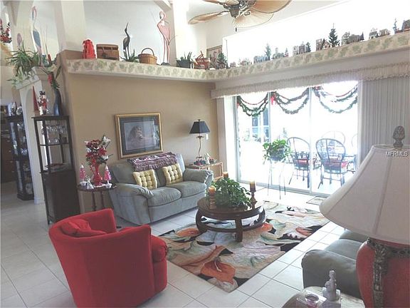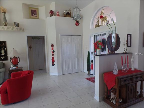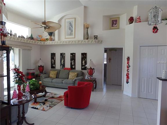 This waterfront property has been meticulously maintained by original owner, all kinds of upgrades including double waterfront lot, volume ceiling, open floor plan, crown molding ,kitchen with island complete with corian counter tops, with view of lake, impact doors and windows, arches and columns, sprinkler system drawn from lake, large covered lanai with build in small pond, pocket doors, large utility room or mud room off garage, oversized garage with circular driveway with extra parking. Split floor plan with tiles. Etched glass entry front door with storm door. The price has been reduced, you will love this floor plan. Easy to show, call realtors