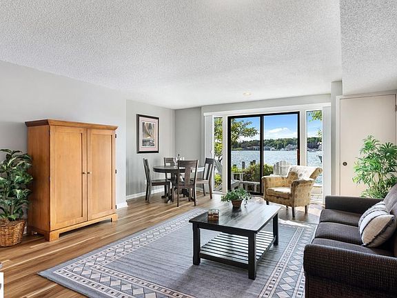 Recently updated lakefront condo in the heart of Downtown Charlevoix. Step inside this ground floor condo and take in romantic views of sparkling Round Lake. Sliding glass doors lead to your own private lake-side patio, just steps from the Edgewater pool where you can watch sailboats and yachts making their way to and from Lake Michigan. A full-size kitchen complete with a dishwasher, fridge, stove, and microwave as well as a 4-seat bar, make for easy-entertaining. The bathroom features a pocket door that connects to the master bedroom. Built-in closet space and a dedicated living/dining area set this condo apart with a larger floor plan than most Edgewater units. Enjoy the Edgewater pool and exercise room. Walk to town to dine, shop and enjoy Charlevoix's wonderful farmers market. With a stunning Lake Michigan beach just across the bridge, you'll be at the beach in no time. Just imagine those postcard views of Charlevoix's red lighthouse.