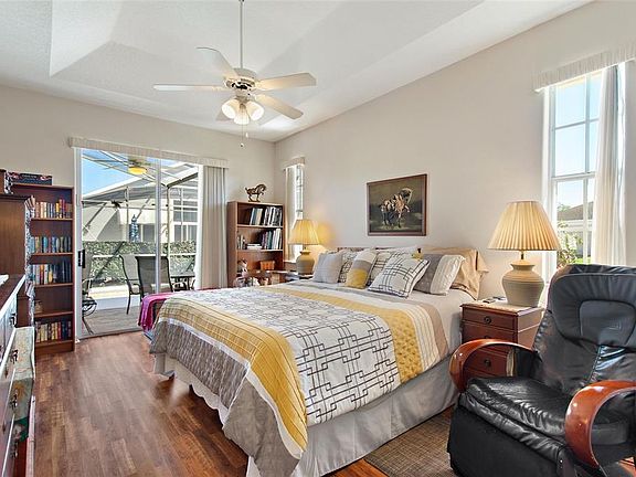 RidgeBrook 3/2/Den model on Corner Lot with New Roof in 2024, 22kW Generac Whole-House Generator, Solid Surface Floors, Tankless Hot Water Heater and a 950+ SF North-Facing Screened Lanai with Saltwater Pool, located 0.1 miles from High Vista's private clubhouse and amenity center. Expanded driveway and walkway to an under-roof front entry with 8 FT Pella double front doors. Central great room with 12 FT ceilings and triple patio doors to pool deck. Cozy family room with custom California Closets built-in entertainment center and extended tray ceiling over dinette area. Galley kitchen has 42” cabinets upper cabinets with end-caps and under-lighting, Corian countertops, dovetailed drawers, ceramic tile backsplash, rollout out drawers in lower cabinets and stainless-steel appliances. Primary en suite bedroom has custom California Closets in the bathroom and the 6x4 lighted walk-in closet, patio door to pool deck, tray ceiling, built-in closet and an expansive bathroom with updated level-entry shower. Split bedroom design offers privacy to guests with a full bath and linen closet between 2 guest bedrooms with extra storage shelves in both closets. Bay window in front Den. California Closets custom built-in cabinets in laundry. Lighted L-shaped exercise pool with depths of 3-5 FT has corner waterfall. Garage has electric rolling screen door, utility sink, 5 installed overhead racks for storage and pull-down ladder access to attic with some flooring. 500 gallon buried propane tank for generator. Roof replaced 2024. Exterior painted 2023. Tankless hot water heater (2020), generator (2015), HVAC (2013) serviced annually. 3 wall-mounted TVs are included in sale. Select furnishings available for sale separately. Sold As-Is. Ridgewood Lakes is a golf cart friendly community. $230 monthly High Vista HOA fee includes Spectrum internet and basic cable TV with 2 cable boxes, lawn mowing and exclusive access to resident-owned 12,000 SF private clubhouse and amenities. $425 semi-annual Ridgewood Lakes HOA fee provides 24x7 staffed security gate and master association-owned private road maintenance. Adjacent to 18-hole White Heron Golf Club with restaurant, privately owned and open to the public. High Vista is a 55+ community with outdoor heated pool and spa, fitness center, library, pub & many organized activities. Pickle ball, tennis, bocce and shuffleboard courts. Miles of biking and walking trails within Ridgewood Lakes gated community. Shopping, Disney, Universal, Orlando & Central FL entertainment nearby, easy access to I-4, medical facilities, airports & Sunrail Station. Advent Health hospital is 3 miles away.