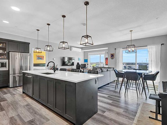Welcome to this immaculate, like-new condo in The Rise, an award-winning building by Cedarglen Living.Offering THREE bedrooms, TWO bathrooms, and 1,165 sq. ft., this thoughtfully designed home combines modern finishes, functional living, and a low-maintenance lifestyle.The open-concept gourmet kitchen is a true highlight, featuring soft-close doors and drawers cabinets with sleek quartz countertops, a spacious pantry, and an oversized quartz island that’s perfect for entertaining. Modern stainless steel appliances—including a full-size fridge, stove, dishwasher, and built-in microwave—complete this well-appointed space. From the kitchen, the layout flows seamlessly into the bright and inviting living room, where nine-foot ceilings and expansive SOUTH-facing windows fill the space with natural light. The living area extends to a covered balcony with a BBQ gas line and scenic views, providing the perfect setting for morning coffee or evening relaxation.The primary suite is designed as a private retreat, complete with a generous walk-in closet and a spa-inspired four-piece ensuite. The secondary bedroom and versatile den offer flexibility for guests, a home office and are complemented by another full four-piece bathroom. A spacious laundry room with a handmade shelf and countertop adds both convenience and extra storage.This home is filled with upgrades, including luxury vinyl plank and tile flooring throughout, extended height cabinetry in the bathrooms and kitchen island, quartz countertops in both the kitchen and bathrooms, central air conditioning, and wall-mounted medicine cabinets in both bathrooms. A separate storage room and a TITLE underground parking stall with secure bike storage further enhance the convenience of this property.The Rise is surrounded by lifestyle amenities, including scenic walking paths, a pedestrian bridge, and a stormwater pond that create a peaceful setting for daily walks. The Harvest Hills community also offers HOA-managed amenities such as tennis courts and recreational spaces, while schools, playgrounds, parks, and the public library are just minutes away. Nearby shopping and dining options include Country Hills Towne Centre and Harvest Hills Crossing, with grocery stores, restaurants, a movie theatre, VIVO Recreation Centre, and T&T Supermarket all within easy reach. Quick access to Stoney Trail, Country Hills Boulevard, and Deerfoot Trail, along with just a 10-minute drive to Calgary International Airport, make this location as convenient as it is desirable. Meticulously maintained by the original owner, this home shows like new and offers a functional layout designed for both comfort and efficiency. With its blend of luxury finishes, vibrant community lifestyle, and prime location, this condo presents a rare opportunity in one of Calgary’s most sought-after neighbourhoods.Schedule your private showing today to experience the comfort, style, and convenience it has to offer.