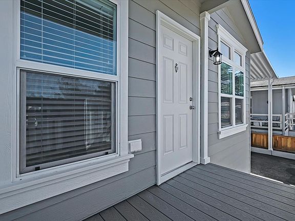 This home is now ready to show! 1 Year New, this 2 BR/2BA 1091SF custom Quality Home is modern, light & bright with floorplan design features and upgrades not found in standard manufactured homes. High ceilings, crown moldings, lots of tall cabinets, beautiful quartz countertops, SS appliances, laminate floors, special lighting, skylights, solar tubes, wide hallways and doors, pocket doors and accessibility features make this a luxury home that will allow for gracefully aging in place. Primary bedroom is spacious, lovely bathroom, large walk-in closet. Enjoy the covered front porch for inside/out living. Valuable site improvements include large new concrete patio and walkways, 8X8 custom shed and carport. Rodeo Estates is one of the most wonderful 55+ communities in Santa Cruz, people are friendly, neighborly and create a great sense of community. Photos were taken in January 2022. 6 years of extended warranty remain. Transaction cancelled through no fault of property or seller.