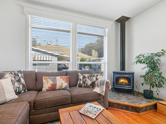 Very rare 1602SFbeauty - with fully furnished option. This home is among the largest homes in any manufactured home community and is situated in a pretty spot with a view of the Soquel Mountain! Sip your morning coffee at the kitchen window or cozy up in front of the fireplace while watching the animals graze in the pasture. Your home is Rodeo Estates, one of the most wonderful adult communities in Santa Cruz. Enjoy the large, spacious kitchen, dining, living rooms and separate den with double doors. An extra wide hallway leads to a beautiful primary suite and glamour bath with 2 sinks, step in shower and soaking tub. Tall 9' flat ceilings, coffered ceilings, crown moldings, wood window sills and gorgeous hardwood floors exude "Quality and Luxury". Extra tall windows, skylights and solar tubes flood the house with light. The side yard has a lovely seating and BBQ area, a large shed and the rear yard is spacious for more outdoor privacy and gardening. Serial # 32760CAA/B