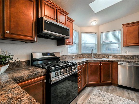 Perfection!!! This 3BR/2BA, 2010 home is sparkling clean has just been beautifully updated. Brand new paint inside and out, brand new luxury vinyl plank flooring throughout, brand new, high quality - never used appliances, sinks, toilets & plumbing fixtures. Cabinets have been beautifully polished and look new. A lovely, move-in ready home with excellent value at this price! The custom floor plan design makes the 1020SF feel larger than its size with special features such as a beautiful kitchen with corner bay window, spacious open living room/dining room, wide hallway, large storage pantry in the utility room, large primary bedroom with walk-in closet, primary bathroom with soaking tub/shower and sliding glass door to out to the private patio. Spacious covered front porch has peek of the mountain, private fenced in concrete rear patio has tall fencing and gate for privacy and lots of area for planting. A wonderful place for entertaining, pets and outdoor living.