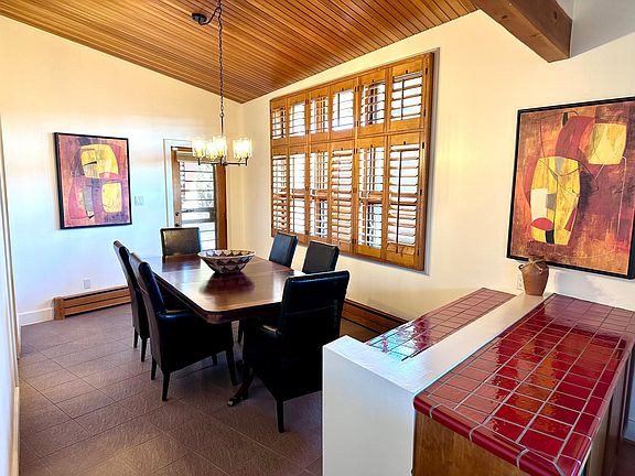 The living room is surrounded by large windows with wood shutters, for maximum sun exposure so you can enjoy sunrise and sunset light to the fullest. Lovely gas fireplace is easy to use and gives off ample warmth, with a large TV right above it. This is the ideal setting to relax with your group in comfort. The dining space seats up to 10 just off the living room.