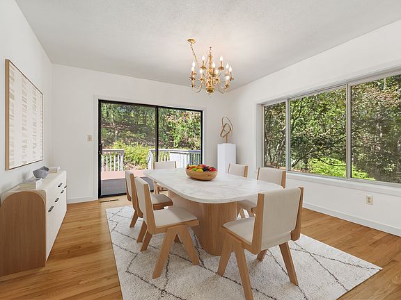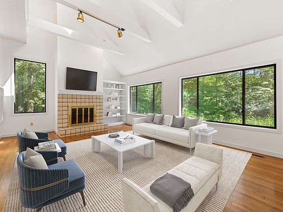 Located on a peaceful cul-de-sac in Stamford's desirable Westover neighborhood, this spacious 4-bedroom, 2.5-bath Contemporary blends comfort and style on 1.77 acres. The sun-filled living room features vaulted ceilings, skylights, a fireplace, and hardwood floors. A separate family room offers a second fireplace, wet bar, and vaulted ceilings-ideal for entertaining. The formal dining room includes a sliding door to a large 896 sq ft deck, perfect for indoor-outdoor living. The kitchen offers a center island, ample cabinet space, and deck access for seamless hosting. The main level also includes a bedroom, half bath, and a large walk-in laundry room and pantry. Upstairs, the primary suite impresses with vaulted ceilings, a walk-in closet, and a luxurious en-suite bath featuring a double vanity, stall shower, and whirlpool tub. Two additional bedrooms with hardwood floors and vaulted ceilings share a full hallway bath. The unfinished basement includes two walk-in cedar closets, a storage room, and access to a two-car garage. Conveniently located near the Merritt Parkway, I-95, Metro North, Fort Stamford Park, Whole Foods, Mianus River Park, and Roxbury Swim & Tennis Club. This well-maintained home offers privacy, space, and easy access to all that Stamford has to offer.