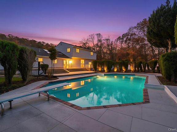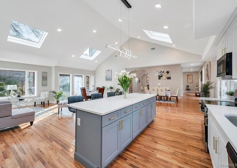 Welcome to 100 Old Northport Road in Kings Park. This 5-bedroom, 3.5-bath colonial in the Smithtown School District offers exceptional space, natural light, and an entertainer-friendly layout. The entire first floor features brand-new wood floors and high ceilings, creating an open and inviting flow across multiple sitting areas. The huge kitchen is the centerpiece, highlighted by impressively high vaulted ceilings, large skylights, modern finishes, and an oversized island. Two sliding doors from the main level lead out to a massive deck overlooking the in-ground pool.