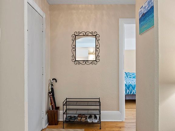 Overlooking the courtyardLarge primary bedroomWall-to-wall closetHardwood flooring