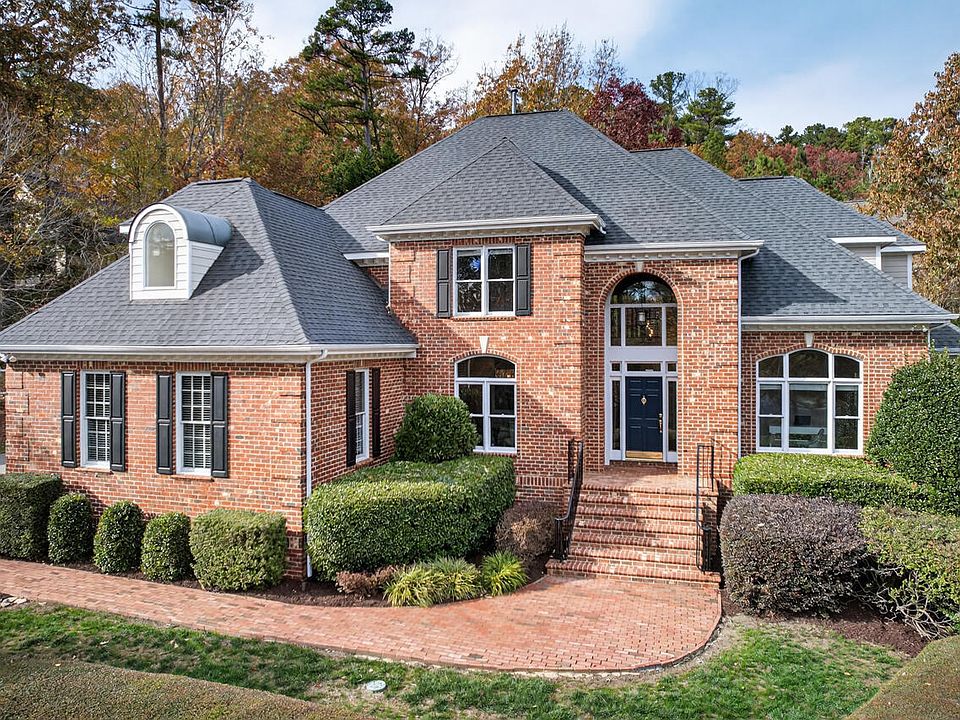 Inviting brick patioElevated positionDedicated home officeExpansive quartz kitchen islandTimeless brick homeScreened porchMain-level primary suite