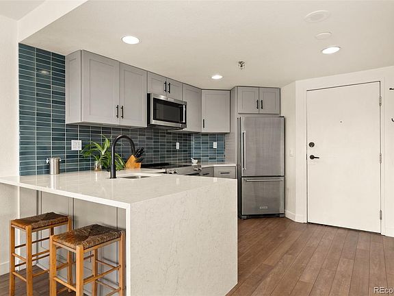 Amazing Deal for a beautifully updated home. City living at its best in this corner unit with eastern exposure and a lovely balcony. treetop views, incredible natural light in all corners of the condo. Luxury finishes, with over $50,000 in upgrades made to this unit in the last 5 years. Contemporary kitchen with matte black finishes, Blue heath tile backsplash, custom kitchen cabinets and sleek white quartz countertops with a waterfall edge. KitchenAid appliances (new in 2021). Washer & Dryer added to the unit in 2022. Plank flooring throughout the open living room and bedroom, modern details continue in the updated bathroom with stacked subway tile, the oversized shower and Room & Board vanity. Updated window coverings, light fixtures, hardware, doorknobs and thermostat. Two, tandem parking spots underground and located right by the elevator for convenience and safety. Community amenities are endless: onsite maintenance and management, secure package delivery, 24/7 gym, outdoor pool/hot tub, cabanas and gas grills. For the four-legged residents "100 Bark Ave" features a private dog park and dog wash! The location can't be beat, walking distance to everything Uptown, Downtown, Five Points and RiNo have to offer. You will fall in love with this condo the moment you walk through the door.