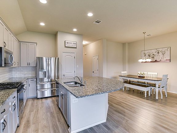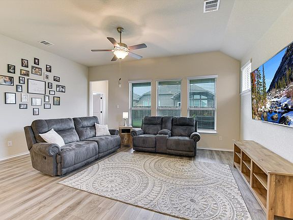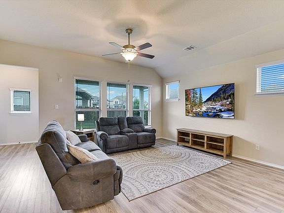 Enjoy a sense of the modern in this 2019 Santa Rita Ranch single story! Find trendy aesthetics inside and out, stylish wood-like flooring in the common areas, and soft gray paint selections throughout, giving this 4 bedroom, 2 bath contemporary a spacious feel. Overlooking the sunlit living room, the gourmet kitchen boasts classic subway tile, gray cabinetry with black hardware, recessed lighting, stainless steel appliances, and a generous granite center island with breakfast bar seating. The dedicated dining area is perfect for hosting those larger, more intimate gatherings. Escape to the expansive primary retreat featuring vaulted ceilings and relaxing primary ensuite complete with double vanity, walk-in closet and sizeable walk-in shower. Two sun-filled bedrooms, overflowing with natural light, will comfortably accommodate family or guests. Make the fourth bedroom a roomy home office or additional bedroom. A clean slate awaits your creative ideas amidst the oversized backyard lot and cozy covered back patio where you can personalize a unique outdoor living space designed to unwind or entertain. Santa Rita’s award-winning amenities are limitless and include sparkling resort style pools, parks, sports courts, splash pads, dog park, 20 miles of nature trails, and two fishing ponds, just to name a few! This vibrant community hosts frequent festivities and events, providing endless opportunities for outdoor activities and recreation. Find Cimarron Golf Course, Lake Georgetown, shopping, dining and so much more nearby!