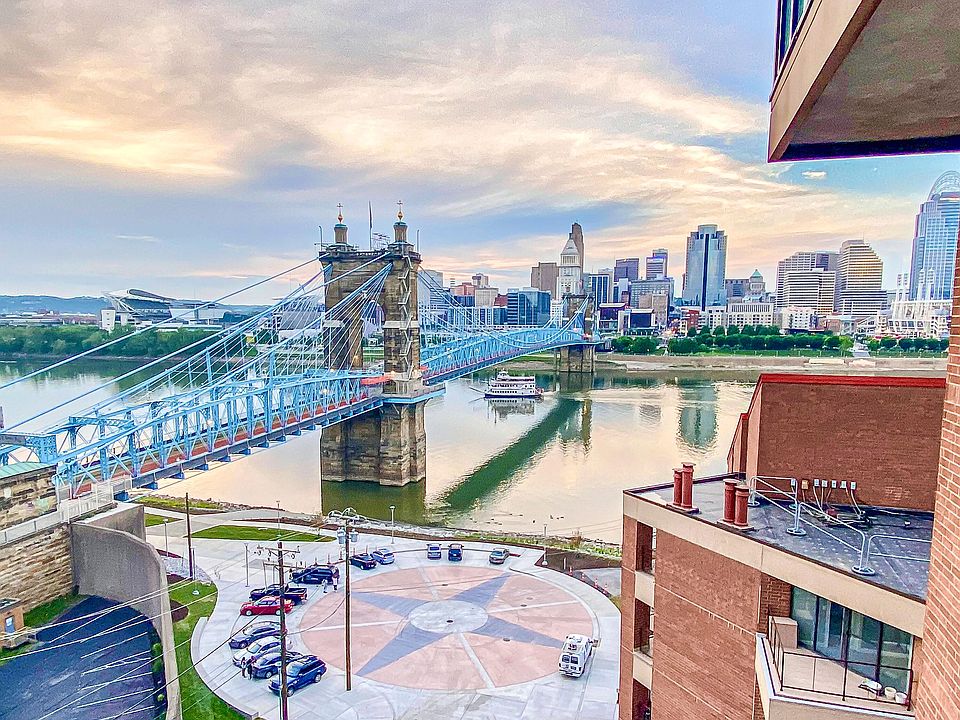 Fall in love with this Luxury Condo and exceptional panoramic views overlooking the historic Roebling Suspension Bridge and downtown! Located in the heart of Covington's Historic Riverside neighborhood, this secluded condo is only steps away from all the City has to offer: Restaurants, Bars, Shopping, Sporting Events, Festivals, Transportation, and more! This 2 bed / 2 full bath unit features premium custom finishes throughout including cabinets, built-ins, hardwood paneling, crown molding, etc. Smart home features include custom lighting controls for each room, climate control, and automatic blinds. Riverside Place is a well-established development with lower HOA fees that include an Inground Pool, common area with grill, gym, storage unit in building, and covered garage parking. This one is a must see!