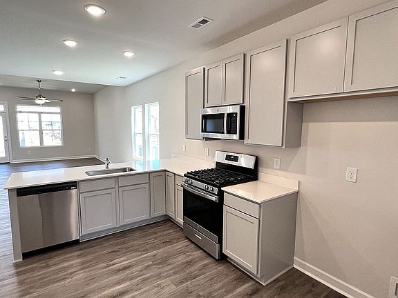 This stunning townhome that is designed with you in mind. A first-floor vaulted ceiling owner’s bedroom with luxury en-suite that includes, Fulton Shadow gray double sink vanity, Shaw Origins Essence resilient floors, full walk-in-shower with shower enclosure and joining large walk-in closet. A spacious living room complete with Minka ceiling fan that flows effortlessly into dining and kitchen area for those who love to cook and entertain at the same time. Fulton Shadow gray cabinets, Fashion White Quartz countertops, Single Bowl undermount Stainless Steel Sink and walk-in pantry make this a dream kitchen. GE Stainless appliances including gas range, microwave and dishwasher. This 3 bedroom, 2 ½ bath includes 5” wide Pride Plus Ambassador luxury vinyl plank flooring throughout first floor main living areas and Shaw Midway Plaza Walking Trail carpet with 8lb pad in bedrooms and second floor. First floor Laundry Room includes Whirlpool washer/dryer and shelving for all your laundry accessories. Work from home or always wanted a TV den, the second-floor loft will be the perfect space to set up both. Last, but not least, your own private rear covered porch where you can enjoy a relaxing atmosphere, blinds on all windows and rear patio door, and a Samsung refrigerator to complete this townhome set up. Buyer's Agent are welcome!