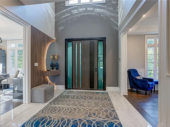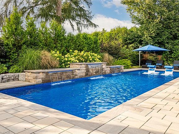 This architectural masterpiece offers 7,000 sq. ft. of luxurious living space with 4+2 bedrooms, 6 bathrooms, an incredible resort-style backyard oasis, and a fully finished basement with separate entrance. Set on an 85 x 135 ft. lot in a mature Ancaster neighbourhood, just one minute to highway access and all Power Centre amenities, this dream home impresses with striking curb appeal, professional landscaping, and an oversized triple garage with 14 ft. ceilings and two car lifts. The grand foyer with a soaring 21 ft. ceiling and curved staircase opens to a sophisticated interior featuring bold millwork, expansive porcelain, and wide-plank hardwood all illuminated by massive windows allowing plenty of natural light. The main level boasts formal living and dining rooms with 12 ft. ceilings, a private office, powder room, mudroom, and a gourmet eat-in kitchen with top-tier appliances. A 4-season sunroom with radiant in-floor heating and a family room with 11 ft. ceiling and stone fireplace create the perfect entertaining spaces. Upstairs, the sensational primary suite includes custom built-ins, spa-inspired 5-piece bath, private balcony, walk-in closet, and a custom dressing room fit for any wardrobe. Three additional bedrooms, all with ensuite baths (heated floors), and bedroom-level laundry complete the upper level. The finished lower level offers a recreation area, home theatre, 2 bedrooms, full bath, second laundry, and kitchenette—ideal for family enjoyment or a multigenerational in-law suite. Step outside to a private resort-style retreat with heated saltwater pool (waterfalls, lights, fire features), sunken hot tub, outdoor kitchen with pizza oven, extensive hardscaping, artificial turf, storage shed, and an elite K-Array sound system. Upgrades include Control4 automation, integrated security with cameras, whole-home sound, and dual furnaces, A/Cs, and HRVs for comfort and efficiency. A rare opportunity to own one of Ancaster’s most extraordinary residences!