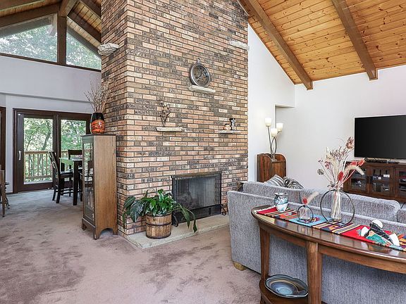 Welcome to this beautifully updated 3-bedroom, 3.5-bathroom ranch home nestled on over 2 acres of peaceful, wooded land. This home offers a perfect balance of modern amenities and serene outdoor living, with a thoughtfully designed layout ideal for entertaining and relaxation. Step inside to find a bright and airy living room with beautiful, vaulted wood ceilings and floor to ceiling brick fireplace. This home also features an updated kitchen with stainless steel appliances, granite countertops, and a cozy eat-in breakfast room. Adjacent to the kitchen is a separate dining room, perfect for hosting family dinners or special occasions. A two-sided gas log fireplace serves as a focal point, offering warmth and ambiance to both the living room and kitchen. The primary suite is a true retreat, featuring two closets, an en-suite bathroom with a walk-in shower, and sliding doors leading to the back deck, where you can enjoy your morning coffee with scenic views. Two additional bedrooms on the main floor are conveniently located near the 2nd full bathroom. The finished walkout basement offers even more living space, complete with a third full bathroom, an office/craft room that can easily serve as a 4th bedroom, a game room with pool table, and a large family room with a second fireplace-this one wood-burning-and a wet bar. This space is perfect for entertaining and features easy access to the backyard and patio. The basement also includes a utility room/workshop area, perfect for hobbies or additional storage. Outdoor living is a highlight of this property, with a large deck on the main level overlooking the expansive, wooded backyard, and a lower-level patio offering even more space for outdoor dining or relaxation. The large front porch provides a charming spot to enjoy the peaceful surroundings and abundant wildlife. With a 2-car garage, plenty of storage, and located close to local amenities and shops, this home offers a unique blend of comfort, convenience, and natural beauty. Don't miss this opportunity to own a peaceful retreat with modern comforts. Schedule your private tour today!