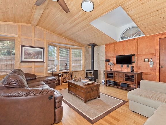 The inviting open-concept layout features warm wood finishes, abundant natural light, and a cozy wood-burning stoveperfect for Mammoth's winters. The remodeled kitchen includes granite countertops, stainless steel appliances, a gas range, and plenty of storage, flowing seamlessly into the dining area with bay windows and access to a private deck.