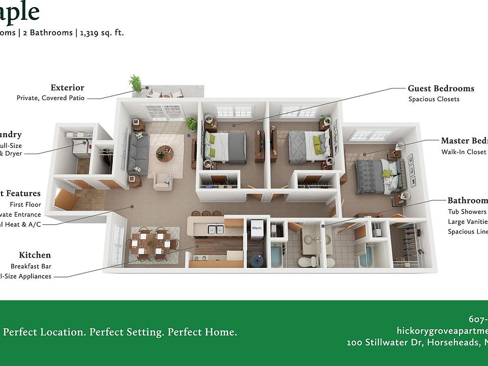 - Exterior features: Cable included in rent, Close to Arnot Mall, Easy Commute to Corning Elmira Ithaca and Sayre, Fiber Internet, Fully Equipped Kitchen, Garbage included in rent, Internet included in rent, Located Near Finger Lakes, Non-Smoking, Open Floor Plan, Perfect Location with Convenience to Shopping and Dining within Minutes, Pet Park, Private Patios & Balconies, Tiled Bathroom Floor and Tub Surround, Upgraded, Upgraded Stainless Appliances (Select Apartments), Upper Level with Private Covered Balcony, View Type: Scenic View (Select Apartments)