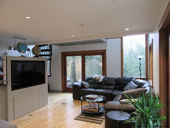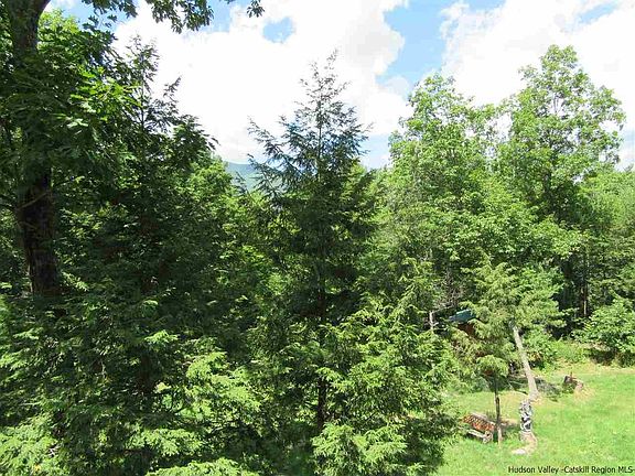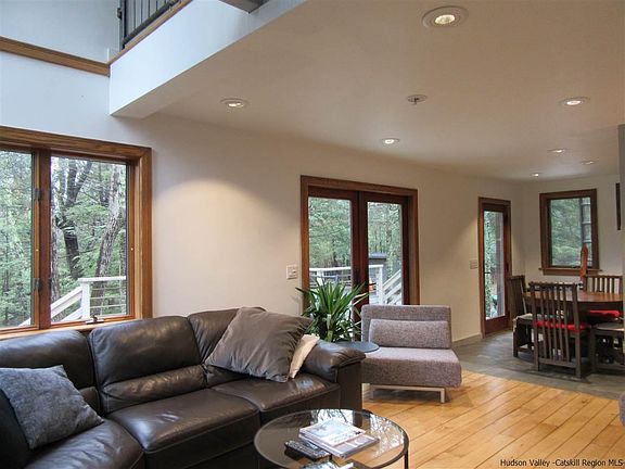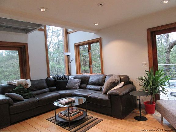 I call this a truly special, private retreat just 10 minutes to either Woodstock or Saugerties. It's even been a recent get away for a current Oscar nominee who craved time for thinking & inspiration while enjoying this light & airy hideaway. You'll find big views of Catskill forest through 12 foot tall fixed windows as well as 3 sets of sliding glass doors opening to outdoor living on two sides of the house. On the second floor there are not only skylights but a tasteful, glorious large arched window viewing the treetops & heavens. Custom rounded walls and even a sleeping loft plus a bright, large master-bath enhance this second story suite. On one end of the spacious room is a high, lovely, sunny balcony with a circular architectural railing great for daytime relaxing & star watching any night. The 2014 updated kitchen includes a Viking stove, Asko dishwasher and pantry and a dutchdoor to the lawn insuring fresh air, views & evermore light! Two exterior seating areas accessed from the living & kitchen areas include a south facing front wood deck and a sweet, classic stone patio with rounded bluestone steps facing east & the woodland valley below the house. The homes passive solar design invites the sun in during winter days while gorgeous tall hemlocks shade much of the house during summers heat. Radiant heat contributes to making winter a charm while central air insures comfort on the occasional hot humid summer day. Rolling lawns are alive with sun, perfect for gardens & play and contrast the woodsy side of the property. It is here that you'll find an above ground saline heated pool with a comfortable designed deck. At the far end of the lawns there is a quality garden-shed & minibarn. The house is accessed via a newly paved driveway and, as a result of perfect siting even at night no other lights intrude on this secluded paradise.