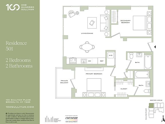 Welcome to 100 Sullivan an exclusive collection of 57 exquisitely designed one- and two-bedroom rental residences, perfectly positioned just two blocks from Prospect Park and moments from Prospect Park at the intersection of Prospect Lefferts Gardens and Crown Heights. With effortless access to the B, Q, S, 2, and 5 trains, this boutique community pairs refined tranquility with vibrant connectivity.