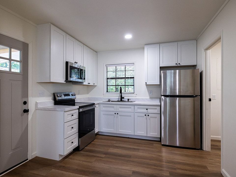 Modern flooringSerene settingUpgraded matte black fixturesCozy layoutBrand-new stainless steel appliances
