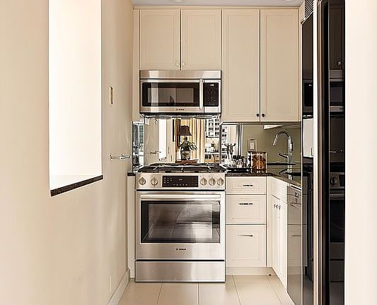 The south-facing living room is bathed in natural light from oversized windows and opens to a private balcony with dramatic city and East River views that include the Empire State and Chrysler buildings among others. This oversized room will comfortably accommodate multiple seating areas and the large dining alcove offers the perfect setting for easy yet elegant entertaining.