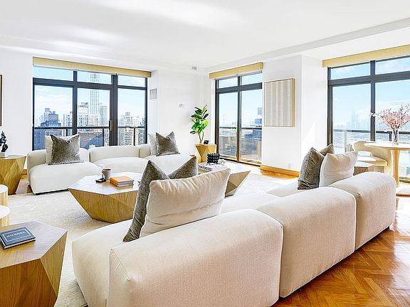 Experience luxury living at its finest on the 38th floor of 100 United Nations Plaza. This expansive 7-room, 3.5-bath residence boasts two wrap-around balconies offering breathtaking views of the city skyline, the East River, three bridges, and the borough of Queens. The interior spans an impressive 2978 square feet, featuring 4 spacious bedrooms, a 14-foot dining room and a generously sized windowed kitchen with elegant serpentine countertops and a GE JP360 stove-top which features an ultra-fast halogen burner, and three "radiant electric" burners, under Ceran glass. Adjacent to the kitchen, there is substantial laundry room complete with a new mega capacity LG washer and dryer plus a 2nd full-size freezer.