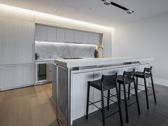 The kitchen, designed by Poliform, includes whitewashed elm cabinetry, Bleu de Savoie marble countertops, and premium Gaggenau and Miele appliances. Each bedroom includes an en-suite bath with radiant heated floors, plus a stylish powder room for guests.