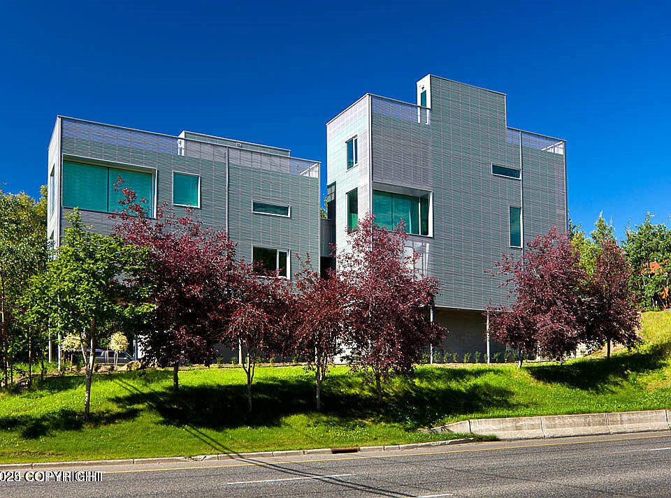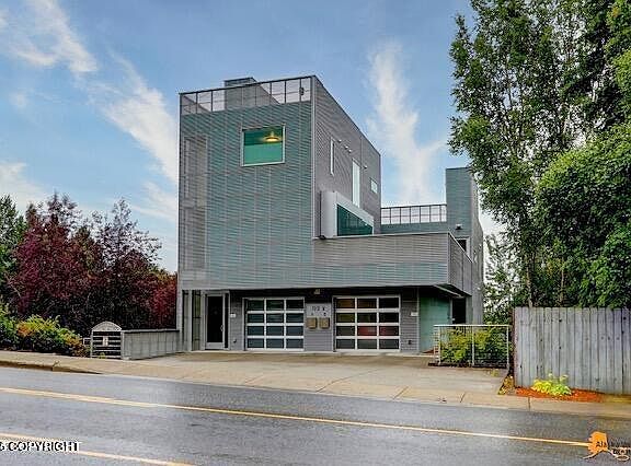 Spectacular Custom Built Contemporary Condo with floor to ceiling glass & views typically reserved for downtown office buildings. Intimate two-unit project with fenced area for garden and a roof top terrace to enjoy our long summer days. Build quality is 10 out 10 utilizing stone, metal, glass and more - architecturally seldom seen in Anchorage. Both bedrooms are ensuite offering a private bath.Unit has full air conditioning. Additionally, the home is heated with infloor-radiant heating and also has a heated driveway.