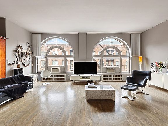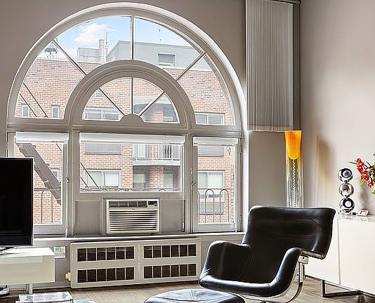 This chic and stylish, sunny Chelsea loft has 12-foot ceilings with two rare, expansive floor to ceiling arched windows, classic details like a cast iron column and exposed brick, hardwood floors, and two full bathrooms. A seamless combination of two studio apartments, this space can easily be converted to a one bedroom by just putting up a windowed wall (see Alternate Floorplan) or you can just keep the vast openness of this almost 1,000 square foot loft in its current configuration. There are also additional rooms that can be used as a pantry, dressing room, or just general storage.