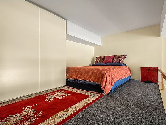 A new wooden staircase leads to the lofted sleeping area above, offering 6 feet of headroom, enough space for a king-sized bed, a generous closet wall and a railing that overlooks the main living area.