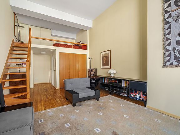 The main living area features double-height ceilings and a striking wall of north-facing windows on West 15th Street, flooding the space in natural light. The open layout, complemented by hardwood floors, allows for effortless flow and easily accommodates a home office nook, a dining table and an inviting living space.