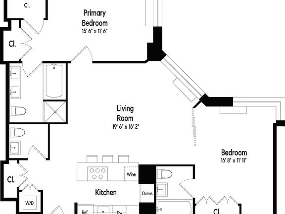 Your king-size primary bedroom with a huge walk-in custom transform closet and en-suite five-fixture bathroom, features a deep soaking tub, separate glass shower and double sinks. The secondary bedroom suite is flexible as it opens up to the living room and offers plenty of closet space and it's own en-suite bath. A full-size vented GE Washer/Dryer within unit and private storage locker in the basement included.