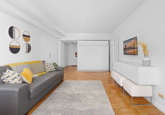 Offered: Furnished Only Term: 1 Year Minimum Available: Immediately upon Board Approval This expansive studio apartment is truly turn-key and furnished with designer pieces. Enter into the foyer with a large custom closet to store all your fashion and be welcomed into the open plan living and dining room. The designer kitchen features ample cabinetry for storage, a full sized dishwasher, gas range, and is accentuated by a powder blue glass tile backsplash and contemporary gray granite counter tops with under-mount sink. The large and bright living and dining room features hardwood floors throughout and bright western exposures from this high-floor unit. It was designed for flexibility to host gatherings large and small with a sofa that transforms into a queen size bed and a dining table with extension leaf to seat 8+. The bed sits behind a built-in, queen size, murphy bed with storage. Another large closet and separate vanity with storage comprise a dressing room located adjacent to the updated bathroom with a clean gray and white aesthetic with storage vanity, large soaking tub, and shower. Centrally located in Midtown Manhattan, Carnegie House is minutes from Central Park, Carnegie Hall, Deutsche Bank Center and express transportation. Amenities include full-time doorman, valet service, on-site parking garage, bike room, and building laundry rooms.