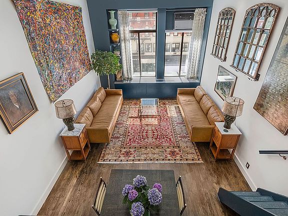 This dynamic, recently renovated hybrid loft/one bedroom boasts 12 ft ceilings, a super-efficient chef’s kitchen, large east-facing windows, gallery walls, and more storage than some houses three times the size. The mezzanine sleeping area offers an eagle’s eye view over the living room and kitchen. Built-in library/display shelves, pre-war architectural details, a walk-in closet plus separate storage loft and double-size coat closet showcase thoughtful design.