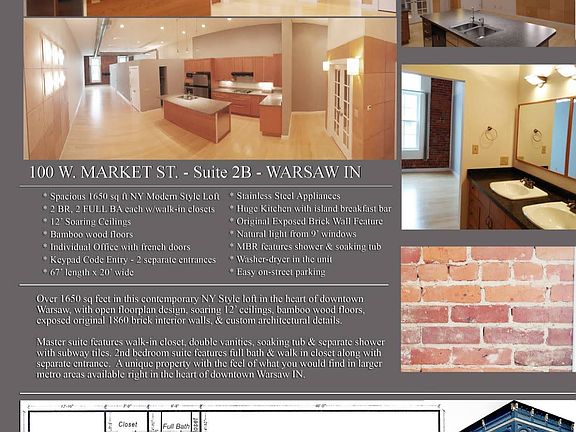 RARELY ON THE MARKET - Available Oct 1st. Massive 1650 sq feet 2BR-2BA NY STYLE LOFT in DOWNTOWN WARSAW IN in historic building. Secure Building with Quick Access Outdoor entry. 2nd Floor Apartment-walk-in closets in both separate bedrooms - bamboo wood floors-soaring ceilings-separate office space with french doors -2nd bedroom has completely SEPARATE main hallway entrance option (can be broken up into 2 separate living arrangements PERFECT for ROOMMATES with different schedules) - washer-dryer in unit - large storage room outside of apartment in hallway (perfect for bikes/etc) - bright massive windows- truly UNLIKE anything else available. Incredibly unique & professional space in historic downtown building. Available for immediate lease. Additional PHOTOS available upon request. VIDEO tour available upon request.