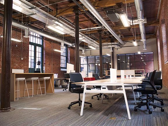 The community is a fully renovated and modernized historic factory complex, adapted into open, modern, flat and loft-style apartments and distinct, cost-effective and collaborate offices for the education sector. Interior spaces feature exposed brick, expansive windows, soaring 10 to 15-foot ceilings, restored original hardwood floors, wood columns and timber framing.