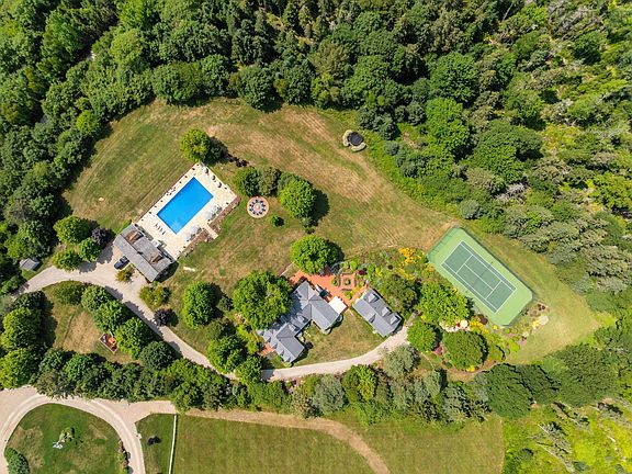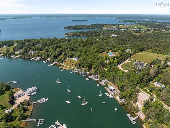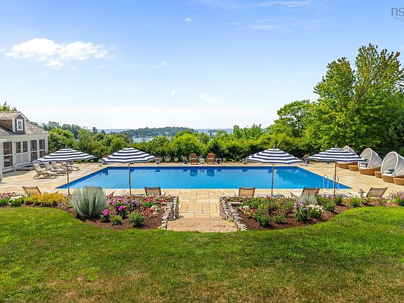 Chester – Nova Scotia’s most prestigious and storied village. Welcome to this all-encompassing, multi-generational retreat/estate; an impressive private “end of the road” 19 acres on four PID’s of ocean panorama, looking down from a hilltop on the village of Chester, the back harbour, and the islands of Mahone Bay. With over 6000 square feet of architecturally brilliant living space, and another 1500 feet of storage, spread across three gorgeous structures, step inside to discover generously proportioned principal rooms, soaring ceilings, and an effortless flow ideal for both comfortable family living and large-scale entertaining, along with sweeping views down cascading lawns to the pool and ocean beyond. Anchoring the estate is the ground floor, open kitchen dining area with adjacent living and bunk rooms. The kitchen is a masterfully designed galley arrangement of antique style cabinetry, concrete countertops, and integrated panel appliances (2 Liebherr fridge/freezers, and two Miele dishwashers). The island, featuring a 48” Viking dual-gas range and bar sink, opens the space seamlessly, with vaulted ceiling enveloping the dining room, which sports in turn hand-hewn beams and ceiling dormer windows. The dining table seats fourteen, eminently suited to festive gatherings. There are many thoughtful features, such as wide-plank walnut flooring, built-in pantry and storage spaces, and shiplap wall panelling. A further vaulted ceiling accentuates the grandeur of the living room, along with expansive two-story windows and a wood-burning fireplace. All three living, kitchen and dining rooms have multiple french door access points to patios, creating a seamless transition to the elegant outdoors. As to the young, sleeping quarters accommodate no less than eight in the bunk room, alongside a triple-sink bathroom with tiled shower and a line of closets for sleepover guests.
