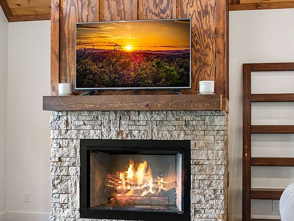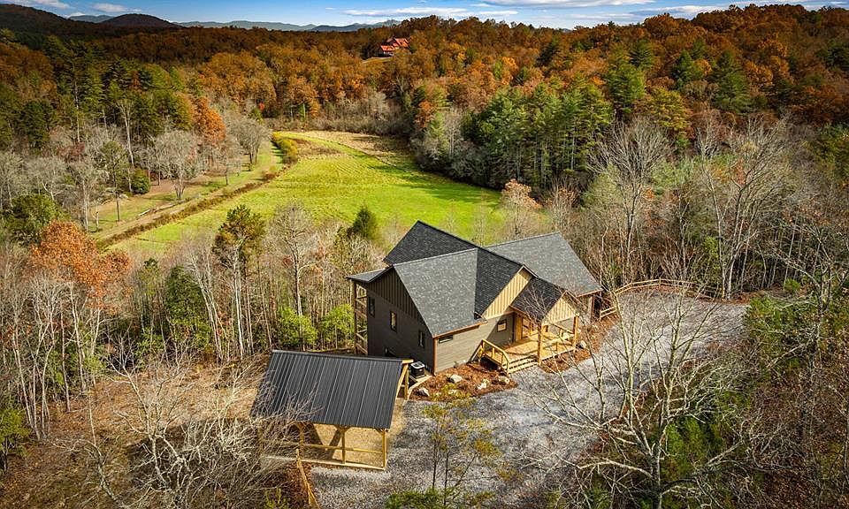 This exceptional new-construction retreat elevates modern mountain living, perfectly situated to capture sweeping pastoral and long-range mountain views. Set in a serene and private location, the home features an open, well-designed floor plan that blends comfort, style, and functionality. The main level offers refined living with two bedrooms and two full baths, including a beautifully finished primary suite with a spacious walk-in closet and a spa-inspired bath. The expansive great room showcases upgraded stainless steel appliances, luxury vinyl plank flooring, Corian countertops, and custom wood cabinetry—with a hidden walk-in pantry adding a thoughtful touch. The kitchen and dining area flow seamlessly into the living room, highlighted by a dramatic floor-to-ceiling stone fireplace that exudes rustic elegance. A split-bedroom layout ensures privacy for guests. The lower level enhances the home's versatility with a generous bonus room perfect for a second family space, recreation area, or media lounge, along with two additional bedrooms and a full bath to comfortably accommodate visitors. Covered decks on both levels extend the living space outdoors, offering ideal areas for gatherings or quiet moments surrounded by natural beauty. A two-car carport provides ample parking, while an upgraded landscaping package further elevates the property's appeal. Convenient proximity to shopping and dining in Blue Ridge and Murphy, NC, along with easy access to the nearby casino, ensures both comfort and entertainment are close at hand. Low-maintenance exterior siding and a 1-year builder's warranty complete this package!
