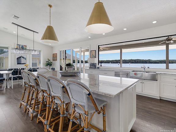 Experience breathtaking views for miles with this extraordinary waterfront property! This stunning home, accompanied by a charming guest house, sits securely on a gated lot and offers the ultimate lakeside living experience. The main house features 5 spacious bedrooms and 4.5 luxurious baths, while the guest house includes 2 additional bedrooms and 1 bath, perfect for hosting family or friends. Step into the exquisite upper-level kitchen, complete with top-of-the-line stainless steel appliances, elegant granite countertops, and an expansive center island that comfortably seats 6 or more. An oversized picture window frames picturesque views of the lake and the enchanting Texas Hill Country, enhancing the inviting atmosphere of the open-concept kitchen, family room, and dining area. The living room exudes warmth with a cozy gas fireplace, soaring ceilings, and large double sliding doors that create a seamless transition to the covered patio, ideal for entertaining or relaxing. Retreat to the serene primary bedroom, which boasts a private balcony offering panoramic vistas. The adjoining primary bath is a spa-like oasis featuring double vanities, a generous walk-in closet, a separate shower, and a jetted tub with stunning views to unwind after a long day. On the upper level, you'll also find a guest bedroom with an ensuite bath along with a convenient hall guest bath. The lower level of the main house offers 3 more bedrooms, 2 baths, and a game room that leads directly to the lakefront. The guest house provides a delightful 2-bedroom layout divided by a spacious living room complete with a coffee bar, perfect for leisurely mornings. Embrace outdoor living at its finest! This property boasts over 150 feet of prime waterfront, featuring 2 boat lifts and a jet ski lift, along with multiple patios and decks that showcase mesmerizing views of the lake. To make it even more enticing, you'll discover a putting green and an exhilarating water slide, making this the ultimate lake house retreat. This exceptional home comes fully furnished and has an elevator! Start making unforgettable memories today!