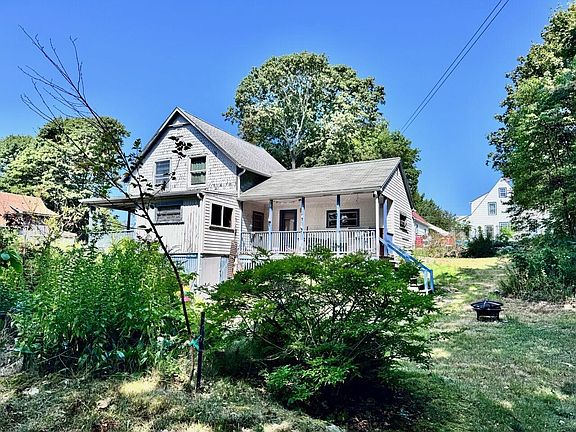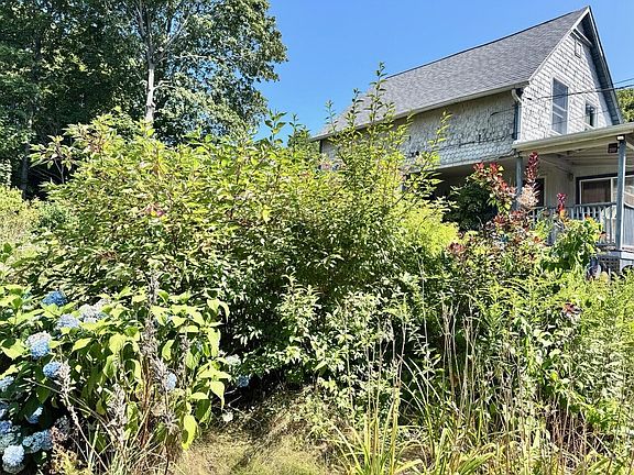 The downstairs has a minimal kitchen and some cool built-ins, plus a fireplace and three sweet sitting porches. Public water and sewer and lots of sun.