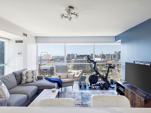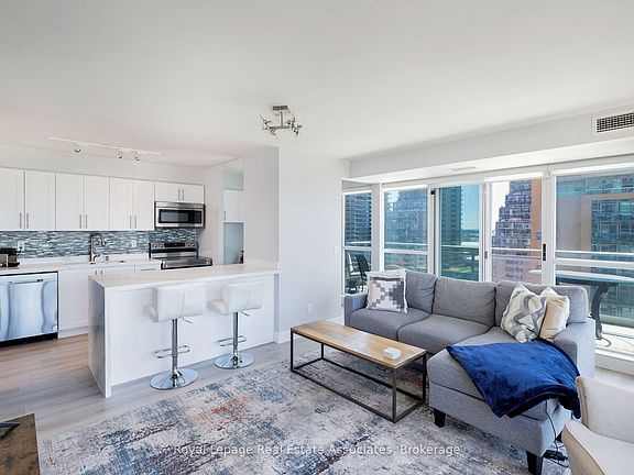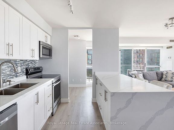 Rare & Beautiful Corner One Bed Plus Den In Liberty Village With Views Of Lake Ontario. This is Liberty Village Living At It's Finest! Very Bright Open Concept 753 Square Feet Of Living Space With Tons Of Natural Light And Floor To Ceiling Windows. Sophisticated Corner Unit With Awesome South & West Views. Two Balconies With Views Of The Lake And To Watch The Sunset! Updated Waterfall Counter Kitchen Island, Bathroom Vanity Counter Top And Light Fixtures. Stainless Steel Appliances, Wall Opened Up In Den Gives Direct Access To Kitchen and Additional Natural Light. Eat-In Kitchen Breakfast Bar Area With Room For Stools, Spacious Primary Bedroom With Huge Closet And A Perfect Bright Den With South Exposure To Function As A Home Office. Mini Dog Off Leash Area Right Across The Street, 95 Walking Score, 92 Transit Score and 88 Biking Score. Move In And Start Living. 1 Parking Space And 1 Locker Included. Excellent Building. Amenities Include Indoor Pool, Gym, Meeting Room, Exercise Room, Guest Suites, Visitor Parking, 24 Hour Security, Viewing Room And Bike Storage.