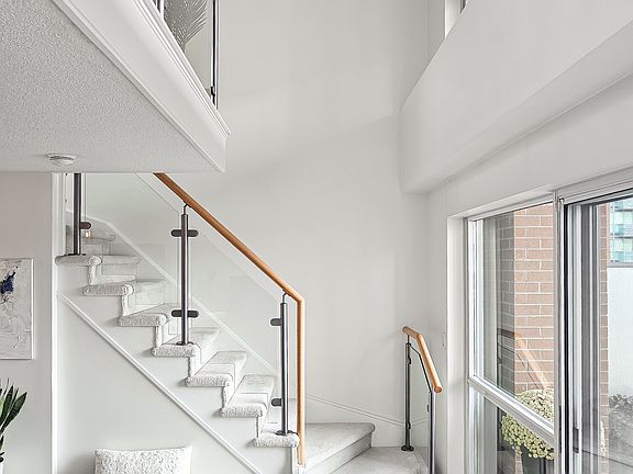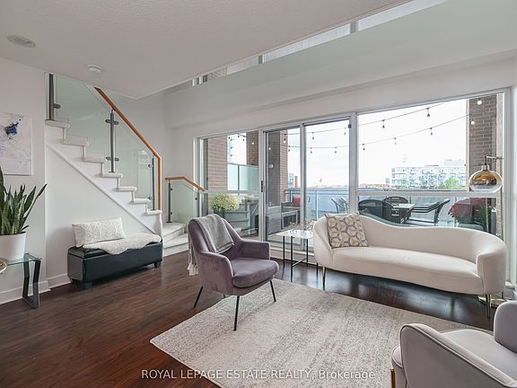 Bright and modern 1-bed, 2-bath loft in Liberty Village. The west-facing 2-storey loft boasts abundant natural light and clear sunset views. The open-concept main floor includes a kitchen, living and dining area, 2-pc powder room and walk-out to the terrace. The bedroom is on the upper level and has a 3-pc ensuite bathroom, new stacked washer and dryer, and a walk-in closet. The large private, covered terrace is ideal for entertaining. It features a wooden patio and string lights, creating a great atmosphere for entertaining or unwinding. One owned underground parking space and one owned storage locker are included. Building amenities include an indoor pool, gyms, media and game rooms, 24 hr security and affordable guest suites. Liberty Village has everything you need at your door, including restaurants, services, and transportation within walking distance.