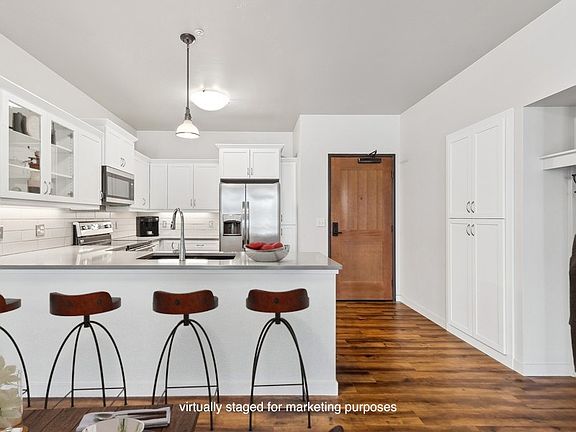 TOP FLOOR END UNIT with beautiful views of Glacier National Park. Barely lived in and never any pets in this unit. This 55+ condominium complex is within a block of Super One for convenient grocery shopping. 2 bedroom 2 bath corner unit has privacy, an open floor plan, private deck with views of mountain and trees, spacious kitchen with quartz countertops, soft closing white cabinetry, includes range, refrigerator, dishwasher, microwave, washer and dryer. Comes with dedicated parking in parking garage along with a storage room. This 9.5 acre campus offers walking paths, a 7000 square foot commons where you can sit by the fire in the enormous central library, enjoy a good movie with family or friends in the movie theater or participate in Active living classes in the Activity Room with Spring Creek frontage. Accessibility Features Other: Elevator; Basement Other: Parking garage; Interior Features Other: Common theater room Common library Common fitness room Common fireplace;