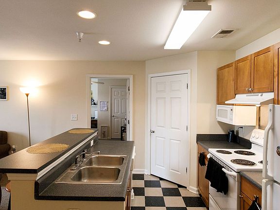 Each bedroom comes with a lofted bed, nightstand, chest of drawers, private bathroom, a built-in desk with chair, a ceiling fan, and a closet. The common area includes a couch, sofa chair, coffee table, end table, TV and TV stand, high bar seating with stools, dining table with chairs, a washer, dryer, dishwasher, microwave, refrigerator, a storage unit (not in all), and a private balcony. A $40 amenity fee includes high-speed Ting internet, trash, storage. There is a quarterly electric allowance of $270 and a $25 per bedroom per month water allowance.
