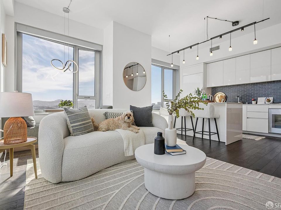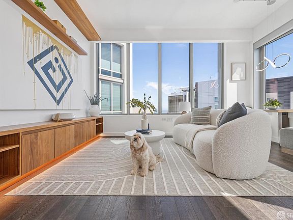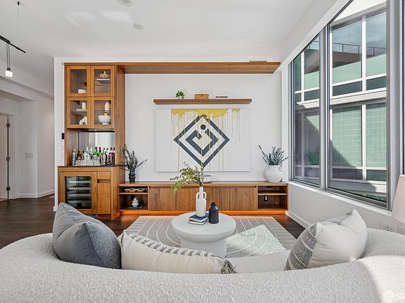 Penthouse-level residence at One Mission Bay! This spacious two-bedroom, two-bath condo with a den features nearly 10-foot ceilings and bright south and west-facing views of Mission Creek, Twin Peaks, Sutro Tower, and gorgeous sunsets every evening. Thoughtfully upgraded with smart home automation, Lutron lighting, electric blinds in every room, and an abundance of custom built-ins that maximize storage and organization, making the most of every square inch. The den offers a perfect flex space for a home office, reading nook, or extra storage. Additional highlights include in-unit laundry, air conditioning, a dedicated parking space with an EV charger, and a built-in wine storage feature in the living room. Located on a limited-access penthouse level shared by only seven residences for added privacy. One Mission Bay offers resort-style amenities: a heated outdoor pool with cabanas, state-of-the-art fitness center and sauna, 24-hour attended lobby, resident lounge, game room, bike storage, and a guest suite for visitors. Ideally located near Mission Creek, Oracle Park, Chase Center, and waterfront trails.