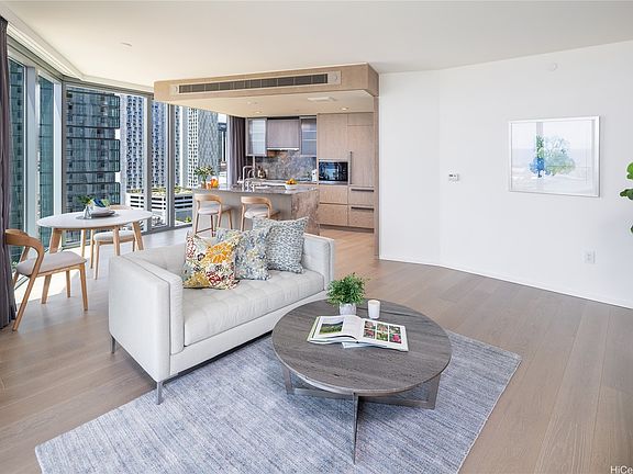 Ko‘ula, designed by Studio Gang with interiors by Yabu Pushelberg, offers resort-style amenities: lap pool, two spas, fitness center, cabanas, BBQs, guest suites, dining rooms, lounge, meeting rooms, children’s play area, and dog park. Enjoy 24/7 security and concierge in a vibrant community steps from Ala Moana Beach Park, Whole Foods, South Shore Market, and top shopping, dining, and entertainment. Experience the best of urban island living in Ward Village.