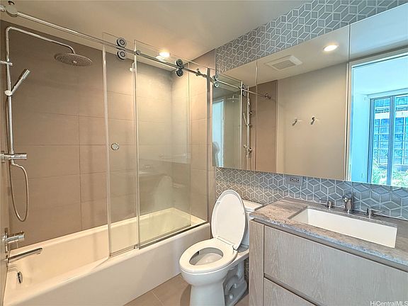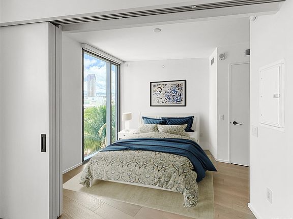 This one bedroom, one bath tower residence features high ceiling and open concept floorpan with a sliding door separating the living room and bedroom. Views of Victoria Ward Park and Kewalo Basin are available through floor to ceiling glass windows and a private lanai. The kitchen is equipped with custom wood cabinets an natural stone countertops, with hardwood flooring throughout most living spaces and ceramic tile flooring in the bath. The primary bedroom features a California Closet system and roller shades throughout the residence.
