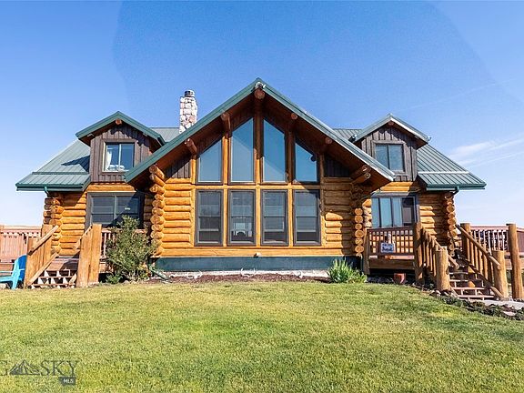 Set on 20 acres with sweeping mountain views, this 4,465 SqFt log home in Manhattan combines rustic beauty with modern comfort. A wraparound porch sets the stage, while inside, you’re greeted by soaring ceilings and a stunning custom rock fireplace making the living room the heart of the home. The open-concept kitchen and dining area are designed for both everyday living and entertaining, featuring a fully remodeled kitchen, a spacious walk-in pantry and a sliding glass door that opens to the porch—where morning coffee comes with incredible views. The main-level primary suite feels like a private retreat, complete with a spa-style bathroom that offers a soaking tub, tiled walk-in shower, dual vanities, and a generous walk-in closet. Another bedroom and full bath are also conveniently located on the main floor. Upstairs, a cozy loft overlooks the living room and leads to two additional bedrooms and a full bath, creating the perfect balance of space and privacy. The finished walk-out basement expands the living space with a bedroom, 1/2 bath, and a versatile layout. A mini kitchen makes hosting or entertaining a breeze, while large storage areas provide plenty of room to tuck things away. With multiple living areas and abundant square footage, this level is ideal for a home theater, hobby space, or game room. Outside, the property is perfectly suited for animals, with open pastures, a loafing shed, and room to roam. Whether you’re watching sunsets from the porch, enjoying the fireplace on a winter evening, or caring for horses in the pasture, this home is a true Montana retreat—built to last with a metal roof and thoughtful updates throughout.