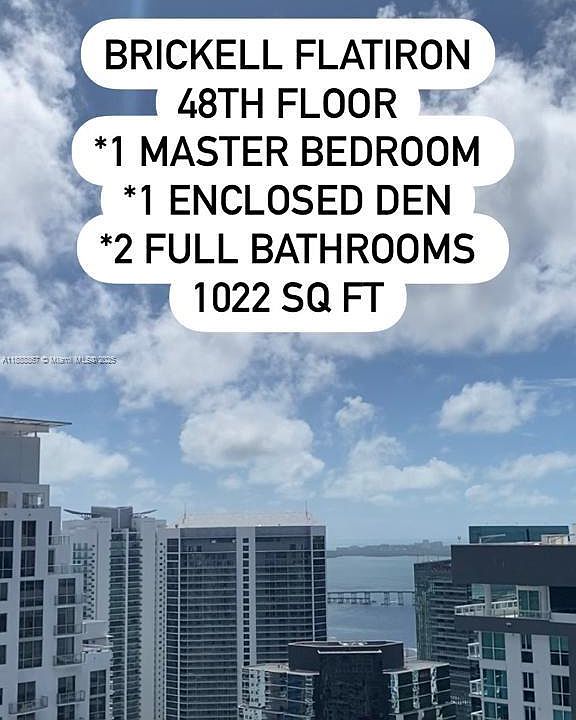 Flatiron Miami - High Floor Unit, coveted views, One Bedroom + Den that can be used as a private home office or second bedroom & 2 Full Bathrooms, custom closets, Miele appliances including Washer and Dryer. This awesome building is all about Lifestyle, conveniently located close to Miami International Airport, Downtown Miami and the Beaches, walking distance to the Financial District, top shopping experiences, entertainment and well-known restaurants, Flatiron have the most Iconic amenities in Brickell, definitely the best new address to live in Brickell