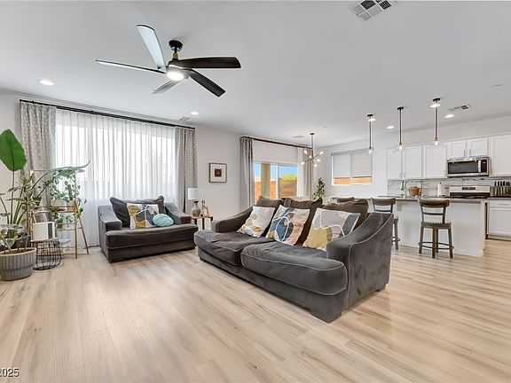 Welcome to 1000 Cetona Court, a beautifully upgraded two-story home in Henderson’s guard-gated Tuscany Village. Nestled at a high elevation with no rear neighbors, this home offers privacy and thoughtful design. Enjoy luxury vinyl plank flooring, added recessed lighting, a modern kitchen with upgraded cabinets, granite island, backsplash, and alkaline water purifier. The serene primary suite features a remodeled shower, with two additional bedrooms and extra padded carpet upstairs. The entertainer’s backyard boasts custom pavers, a patio cover, turf, an olive tree, and space for future planting. Exterior upgrades include side gates, pavers, a trash enclosure, and a Tesla charger in the garage with fridge, stove, microwave, and two steel shelves. Tuscany’s resort-style amenities include a 30,000 sq ft rec center, fitness, pools, golf, and trails. A must-see Henderson gem!